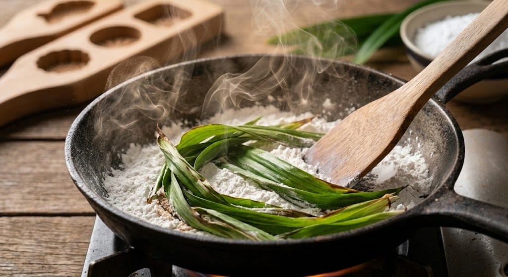 Bước 1: Rang bột – Nghệ thuật "thử" độ chín bằng lá dứa
