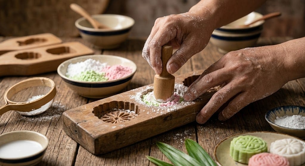- Chuẩn bị khuôn (khuôn gỗ truyền thống hoặc khuôn silicon hiện đại). Thoa một lớp bột áo mỏng vào lòng khuôn để chống dính.