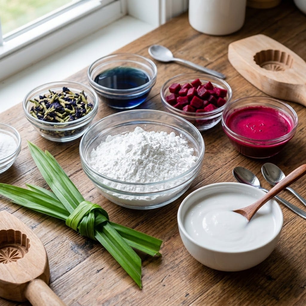 - Lá dứa tươi: 1 nắm (khoảng 10 - 12 lá). Chia làm 2 phần: một phần cắt khúc để rang bột, một phần xay lấy nước cốt tạo màu.