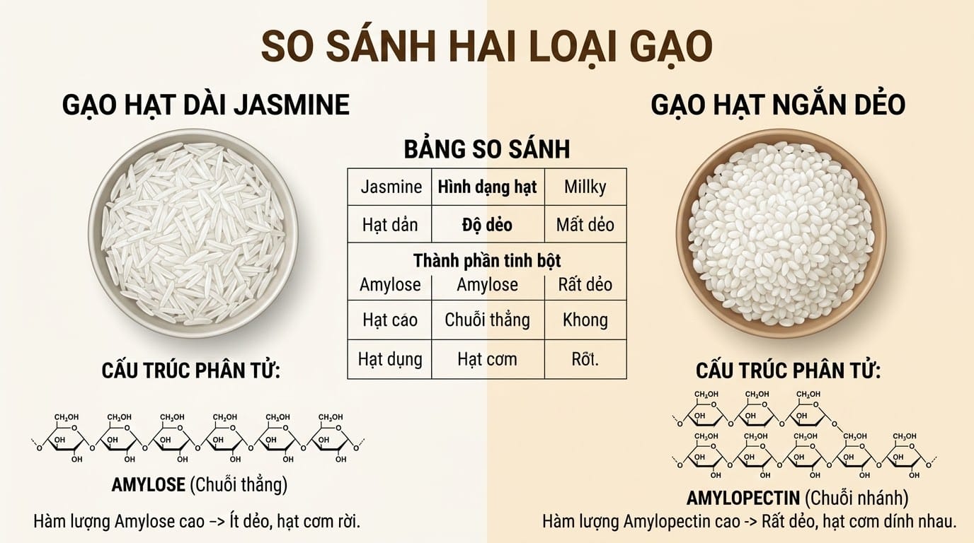 Trong thế giới của tinh bột, có hai nhân vật chính quyết định độ dẻo hay tơi của cơm: Amylose và Amylopectin. Gạo chứa hàm lượng Amylose cao (thường từ 20-25%, có nhiều trong gạo hạt dài như Basmati hoặc các loại gạo cũ) sẽ cho hạt cơm cứng, rời và ít kết dính. Ngược lại, Amylopectin (chiếm ưu thế trong gạo nếp hoặc gạo Nhật hạt ngắn) chính là "chất keo" tạo nên độ dẻo dính đặc trưng.