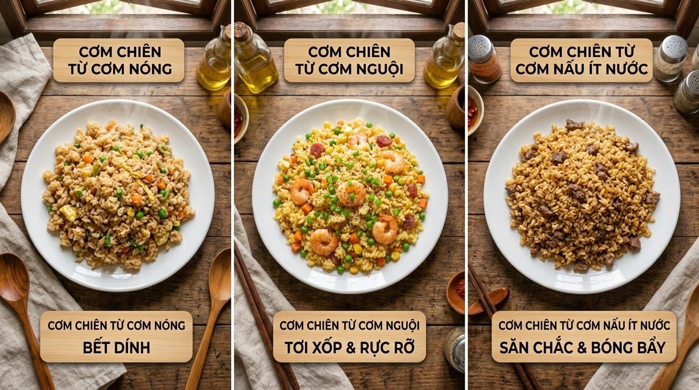 | Đặc điểm | Cơm mới nấu (Nóng) | Cơm nguội (Để tủ lạnh) | Cơm nấu ít nước + Dầu ăn |