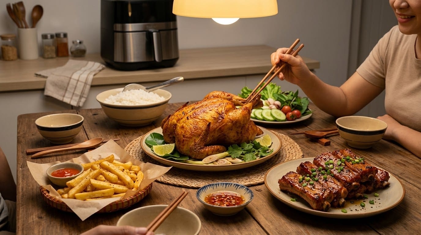 Một xu hướng khác là nồi chiên hơi nước (Steam Air Fryer). Đây là sự kết hợp giữa chiên không dầu và hấp. Nó giải quyết triệt để điểm yếu lớn nhất của NCKD là làm đồ ăn bị khô. Món gà nướng bằng công nghệ này sẽ có lớp da giòn nhưng thịt bên trong mọng nước như vừa được hấp sơ qua vậy.