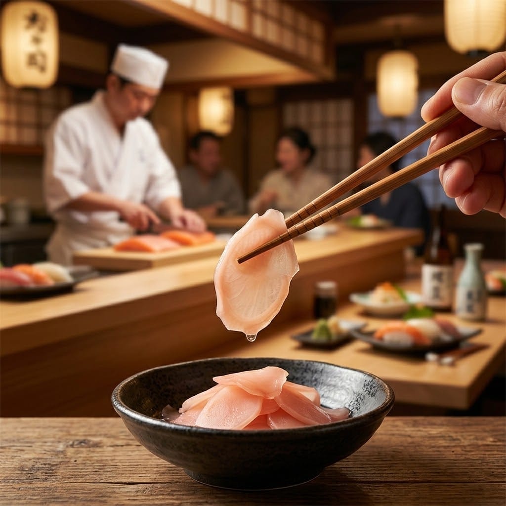 Nếu bạn là một "tín đồ" của ẩm thực Nhật Bản, chắc hẳn hình ảnh những lát gừng mỏng tang, mang sắc hồng nhạt tinh khôi đặt cạnh những miếng Sushi đầy màu sắc đã trở nên quá quen thuộc. Khi đưa một lát gừng vào miệng, cảm giác đầu tiên là cái giòn sần sật, sau đó là vị chua thanh của giấm, ngọt dịu của đường và cuối cùng là cái hậu vị cay nồng đặc trưng bùng nổ, đánh thức mọi giác quan.