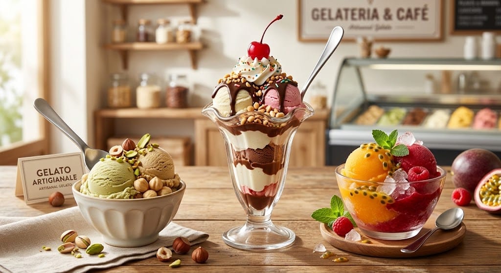 - Gelato: Khác với kem thông thường, Gelato của Ý dẻo mịn hơn, ít béo hơn nhưng lại cực kỳ đậm đặc hương vị tự nhiên của trái cây, hạt dẻ hay hạt dẻ cười.