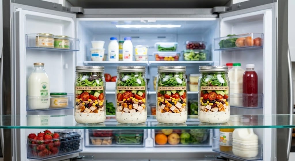 - Kỹ thuật Mason Jar (Lọ thủy tinh): Bạn dùng một chiếc lọ thủy tinh cao. Cho nước sốt xuống đáy lọ trước. Tiếp đến là các loại rau củ cứng như ngô, dưa chuột, bông cải. Tiếp theo là thịt gà. Cuối cùng mới là xà lách ở trên cùng.