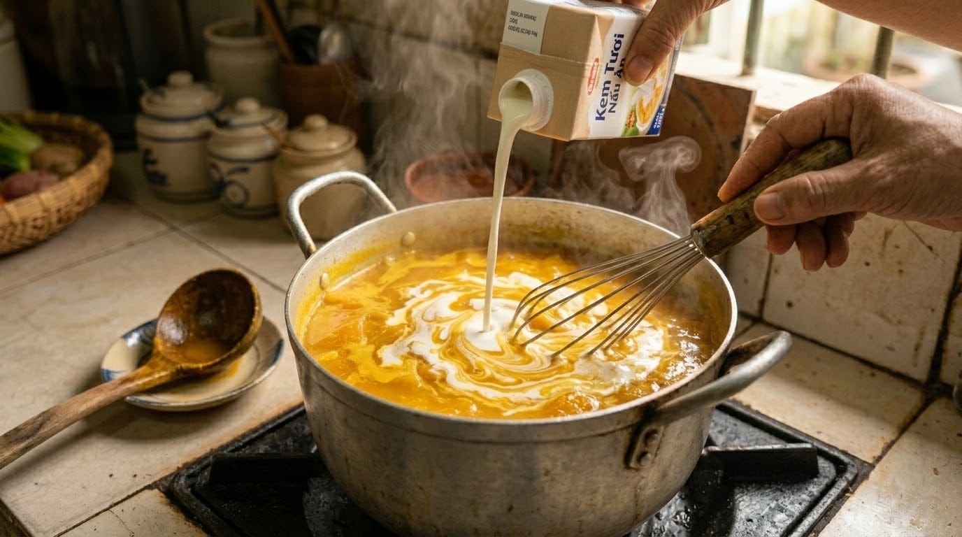 Lúc này, căn bếp của bạn sẽ tràn ngập một mùi thơm béo ngậy rất dễ chịu. Nêm nếm thêm một chút muối, tiêu trắng cho vừa khẩu vị. Một lưu ý "xương máu" là bạn chỉ đun đến khi súp chớm sôi (vừa sủi tăm nhẹ ở mép nồi) là phải tắt bếp ngay. Việc để súp sôi sùng sục sau khi cho sữa và kem tươi sẽ làm súp bị tách lớp, mất đi độ mịn mượt như nhung.