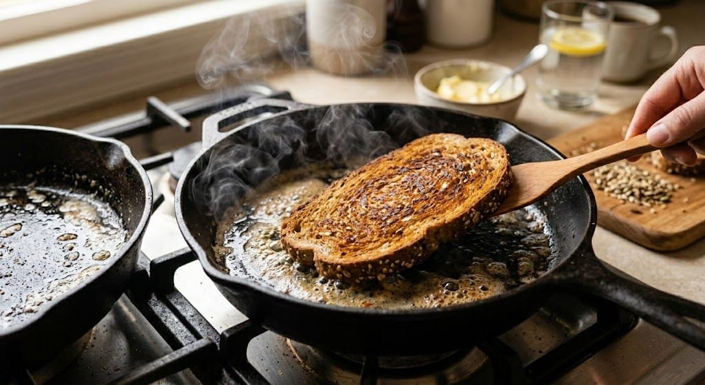 - Cách 1: Dùng chảo (Dành cho độ giòn xốp truyền thống): Bạn bắc chảo lên bếp, để lửa vừa. Khi chảo nóng, phết một lớp bơ lạt mỏng hoặc nhỏ vài giọt dầu oliu. Cho bánh mì vào áp chảo. Bạn sẽ thấy mặt bánh dần chuyển sang màu nâu sẫm, các hạt ngũ cốc đính trên vỏ bánh bắt đầu dậy mùi thơm nức. Áp chảo mỗi mặt khoảng 1-2 phút cho đến khi cạnh bánh vàng giòn nhưng tâm bánh vẫn còn hơi mềm.