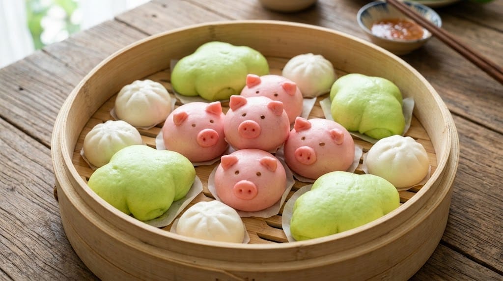- Bánh bao tạo hình con vật: Thêm một chút bột màu thực phẩm hoặc nước cốt lá dứa (màu xanh), nước cốt gấc (màu cam) để nặn hình chú heo con, chú nhím cho các bé. Đảm bảo các bé sẽ thích mê!