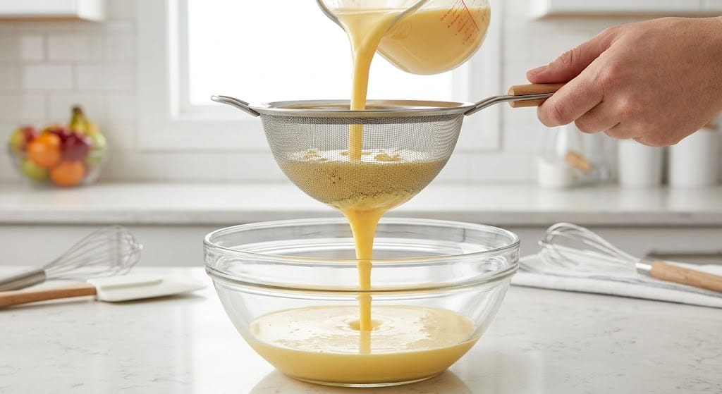 Đây là bước "sống còn" để bánh mịn như nhung. Bạn hãy lọc hỗn hợp trứng sữa qua rây ít nhất 2 lần. Việc này giúp loại bỏ những lợn cợn lòng trắng không tan và bọt khí li ti. Sau khi lọc, nếu vẫn còn bọt trên bề mặt, hãy lấy thìa vớt sạch hoặc dùng giấy thấm nhẹ.