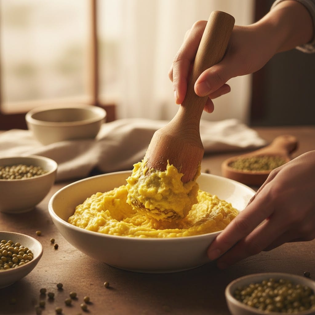 - Sên nhân (Công đoạn quan trọng): Cho hỗn hợp đậu đã xay vào chảo chống dính. Sên ở lửa nhỏ nhất. Bạn cần khuấy liên tục và đều tay để đậu không bị cháy khét ở đáy chảo. Khi thấy nhân bắt đầu đặc lại, Bạn cho vani vào. Tiếp tục sên đến khi nhân thành một khối thống nhất, mịn, dẻo, không còn dính vào chảo hay dính tay là được.