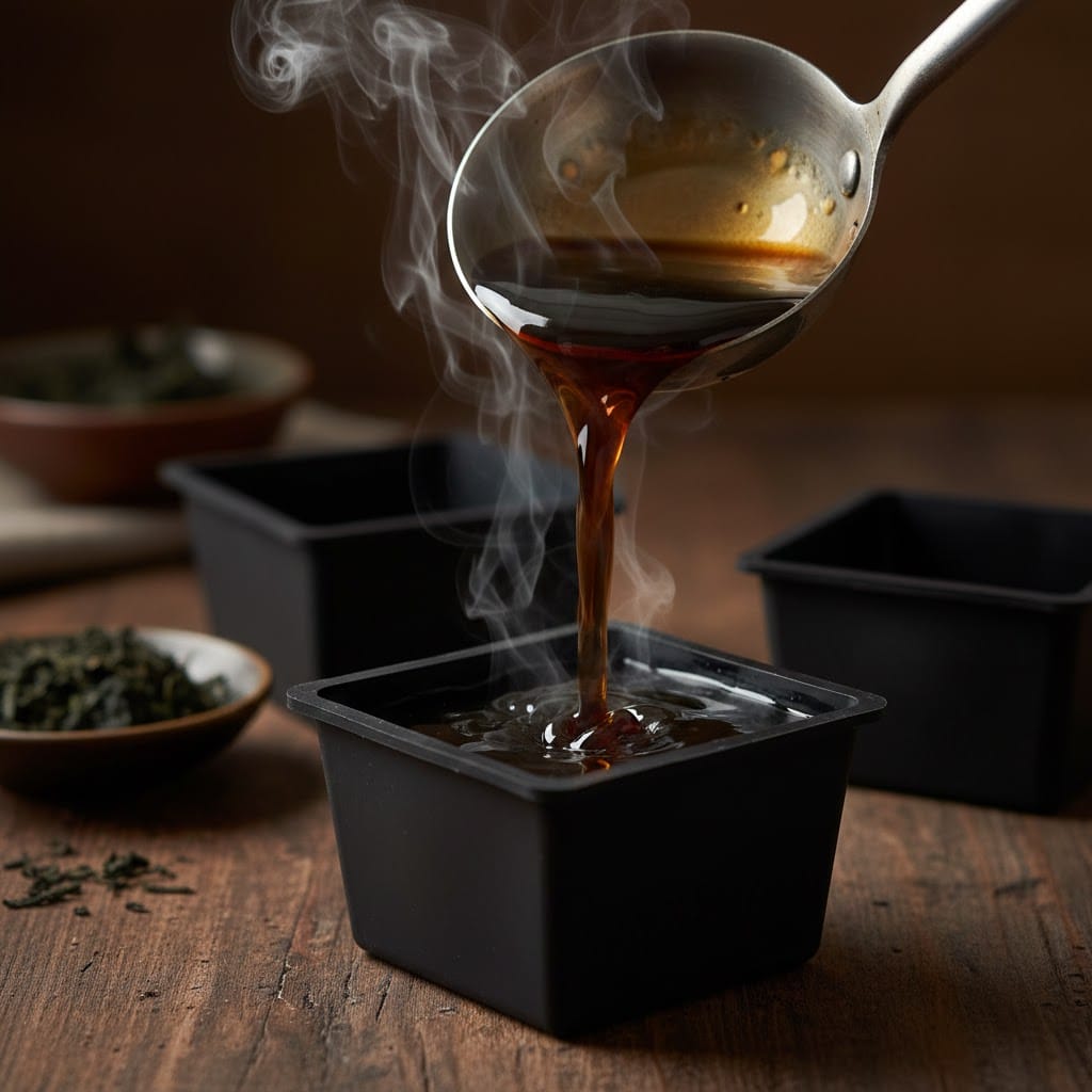 - Đổ lớp nền: Bạn chuẩn bị khuôn (có thể dùng hộp nhựa thực phẩm hoặc khuôn silicon). Đổ một lớp thạch đen dày khoảng 1cm - 1.5cm vào đáy khuôn.