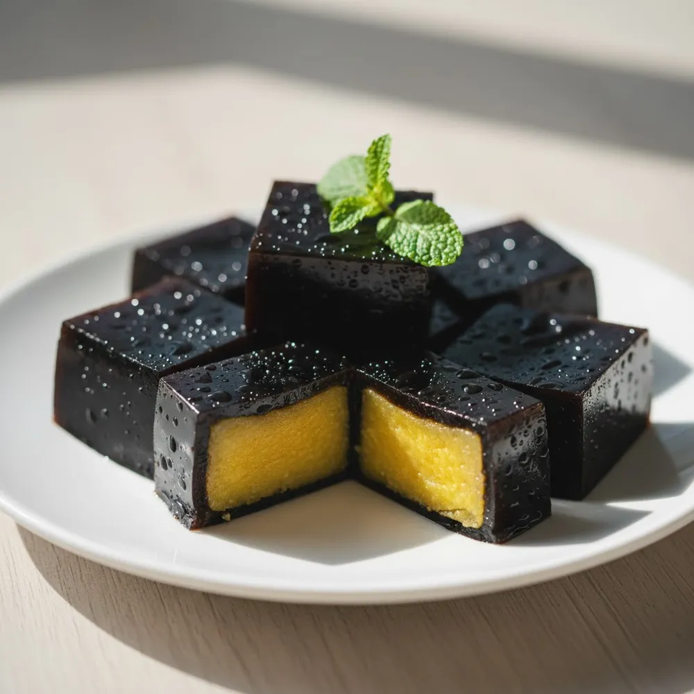 Sức hấp dẫn của món bánh này đến từ sự đối lập đầy tinh tế. Lớp vỏ thạch đen bên ngoài mang vị thanh khiết, hơi nhẫn nhẹ một chút ở hậu vị – cái nhẫn đặc trưng của thảo mộc tự nhiên. Đối nghịch với nó là phần nhân đậu xanh vàng óng, ngọt dịu và thơm nồng. Hai hương vị tưởng chừng không liên quan lại hòa quyện vào nhau một cách hoàn hảo, tạo nên một bản giao hưởng vị giác khó quên.