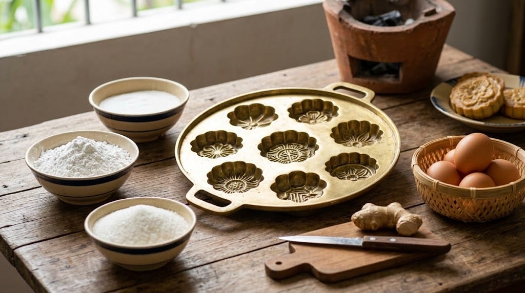 - Dụng cụ: Khuôn bánh thuẫn (bằng gang hoặc nhôm là tốt nhất), máy đánh trứng cầm tay, và lò than (hoặc lò nướng/nồi chiên không dầu).