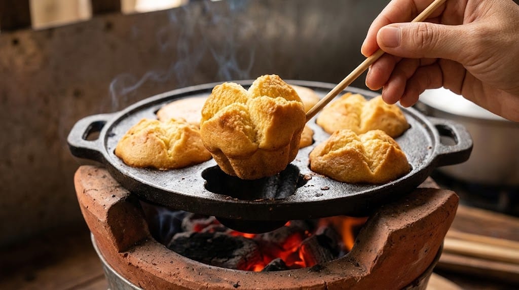 - Kỹ thuật nhiệt lượng: Đậy nắp khuôn lại. Đặc biệt, bạn cần gắp thêm một ít than hồng để lên trên nắp khuôn. Nhiệt độ "trên ép xuống, dưới đẩy lên" sẽ giúp bánh chín đều và nở rộ.