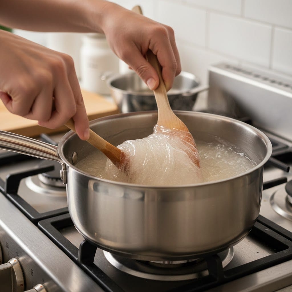 - Lưu ý: Mục tiêu của chúng ta là làm bột "nửa sống nửa chín". Khi thấy bột bắt đầu đặc sệt lại, nặng tay và chuyển sang trạng thái hơi đục (chưa trong hoàn toàn), bạn lập tức nhấc nồi ra khỏi bếp. Đừng để bột chín hẳn trên bếp vì khi đó sẽ rất khó gói và bánh sau khi hấp sẽ không được dai.