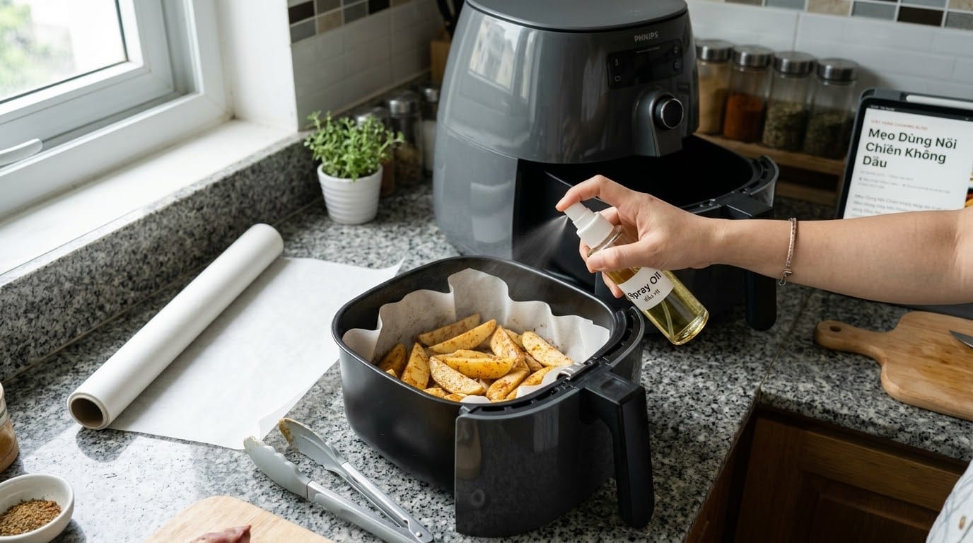- Làm nóng nồi trước: Đây là quy tắc "vàng". Hãy bật nồi ở 180°C trong 3 phút trước khi cho đồ ăn vào. Việc này giúp thực phẩm tiếp xúc với nhiệt cao ngay lập tức, khóa chặt độ ẩm bên trong và làm vỏ ngoài giòn hơn.