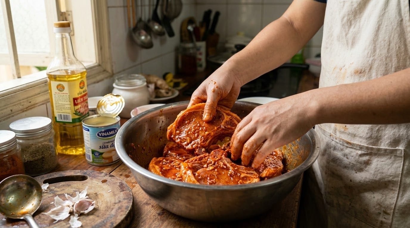 - Ướp sườn: Cho tất cả gia vị đã chuẩn bị vào tô lớn, khuấy tan rồi mới cho sườn vào. Tại sao lại dùng sữa đặc thay vì đường? Sữa đặc có độ béo giúp bao bọc các thớ thịt, giữ nước bên trong không bị thoát ra khi gặp nhiệt cao. Đồng thời, đường trong sữa đặc khi nướng sẽ tạo ra màu nâu cánh gián cực kỳ đẹp mắt mà không dễ bị cháy khét như đường cát thông thường.