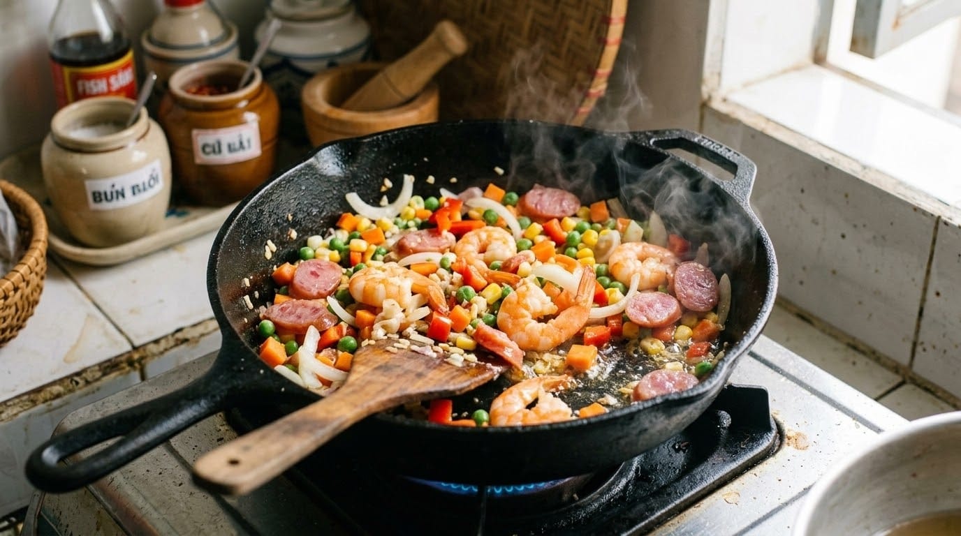 Tại sao cơm chiên của mình hay bị bết dính dù đã dùng lửa lớn? Câu trả lời thường nằm ở độ ẩm của cơm. Có thể cơm của bạn còn quá nhiều hơi nước hoặc bạn dùng quá nhiều dầu ăn ngay từ đầu. Một mẹo nhỏ là sau khi trộn trứng vào cơm, bạn hãy để cơm nghỉ khoảng 5-10 phút để trứng thấm và làm khô bề mặt hạt cơm trước khi cho vào chảo.