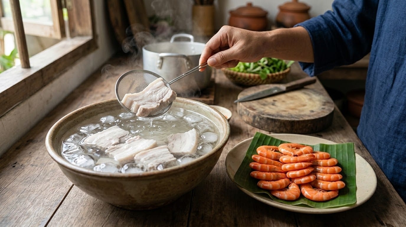 ### Bước 2: Bí quyết luộc thịt trắng giòn và tôm đỏ au