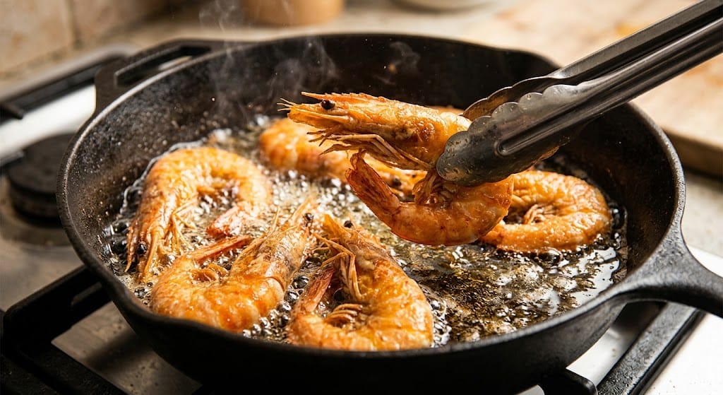 Bí quyết 2 — Dầu phải đủ nóng: Dầu không đủ nóng sẽ khiến tôm hút dầu và vỏ mềm nhão. Kiểm tra bằng cách thả đầu một con tôm vào — nếu dầu sôi mạnh ngay lập tức là đã đủ nóng để chiên.
