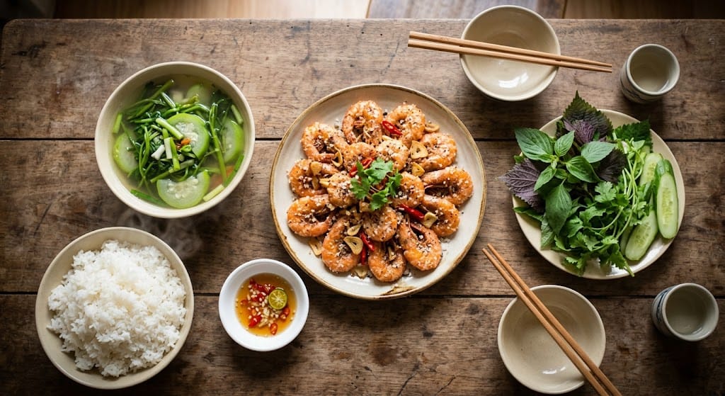 Cơm trắng nóng hổi là lựa chọn chuẩn nhất. Ngoài ra rất hợp với bánh mì gối, salad rau xanh trộn giấm, hoặc uống cùng bia lạnh trong bữa nhậu cuối tuần. Vắt vài giọt chanh tươi lên tôm trước khi ăn sẽ giúp cân bằng vị mặn và làm dậy lên hương vị biển tươi ngon hơn nhiều.