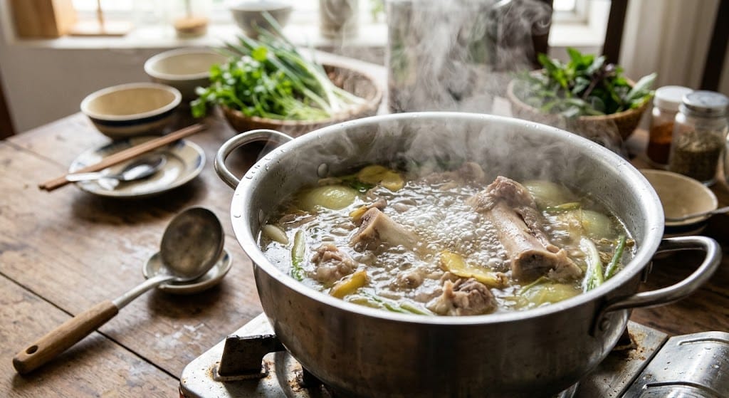 - Mẹo của mình: Khi nước bắt đầu sôi, bạn hãy hạ lửa nhỏ liu riu và nhớ hớt bọt liên tục. Đừng đậy nắp nồi trong lúc ninh để nước dùng giữ được độ trong vắt, không bị đục ngầu nhé! Ninh trong khoảng 45-60 phút là bạn đã có một nồi nước cốt ngọt lịm từ xương rồi.