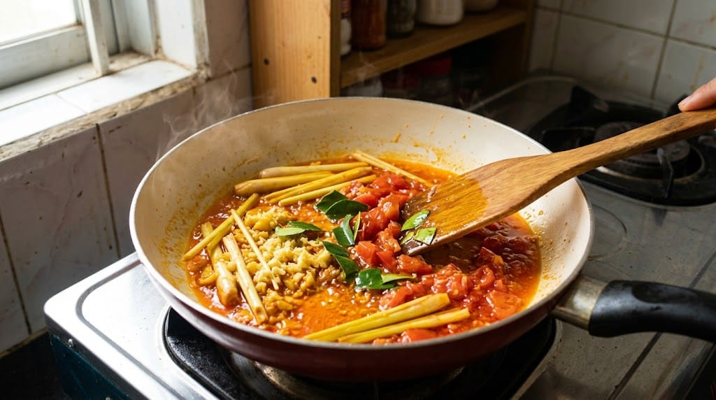 Tiếp theo, cho sả, riềng và lá chanh vào xào cùng. Ngay lập tức, một mùi thơm cực kỳ nồng nàn sẽ lan tỏa khắp căn bếp. Đừng dừng lại đó, hãy cho cà chua và dứa vào đảo đều. Khi cà chua bắt đầu chín mềm và tiết ra màu đỏ đẹp mắt, bạn cho 2 muỗng canh sốt Tom Yum vào xào chung. Lúc này, hỗn hợp gia vị sẽ sệt lại, óng ánh và có màu đỏ cam cực kỳ kích thích.