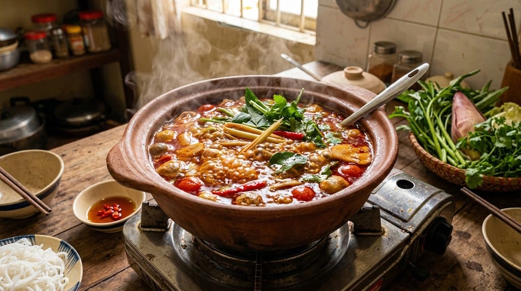 Bước 4: Nấu nước lẩu và cân bằng vị "Chua - Cay - Mặn - Ngọt"