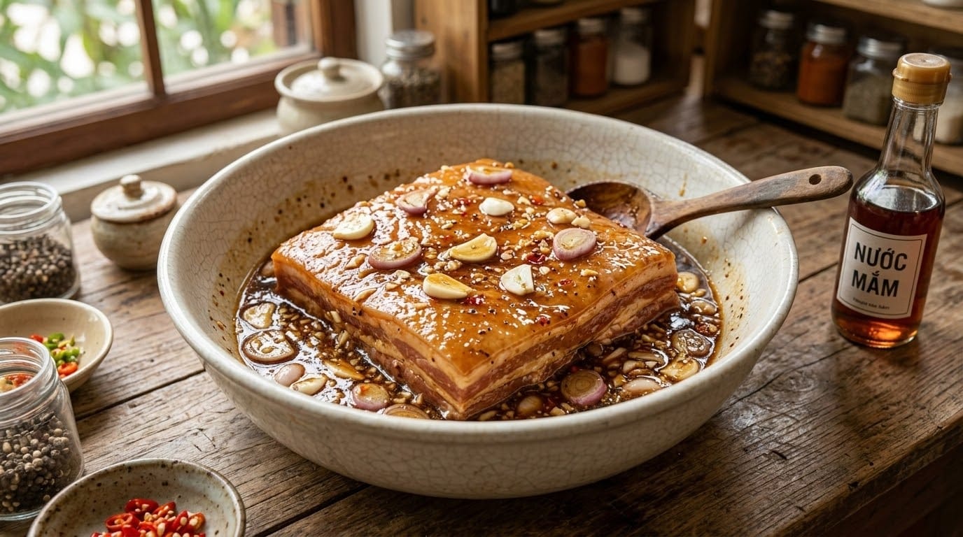 Đây là lúc chúng ta thổi hồn vào nguyên liệu. Việc ướp thịt cần đủ thời gian để gia vị len lỏi qua từng lớp mỡ và thịt nạc.
