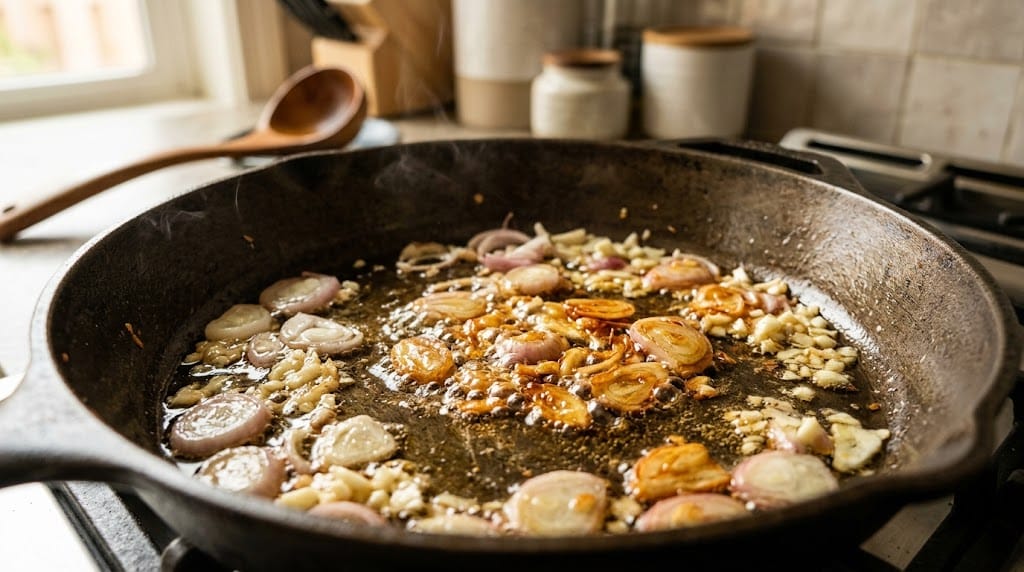 Việc tuân thủ thứ tự này đảm bảo rằng khi hành vừa đạt độ giòn thì tỏi cũng vừa kịp chuyển sang màu vàng, không có bên nào phải "hy sinh" vì bên nào. Nếu bạn đang định làm một món như Bánh mì bơ tỏi bằng nồi chiên không dầu, kỹ thuật kiểm soát thời gian tỏi chín vàng cũng quan trọng tương tự đấy.
