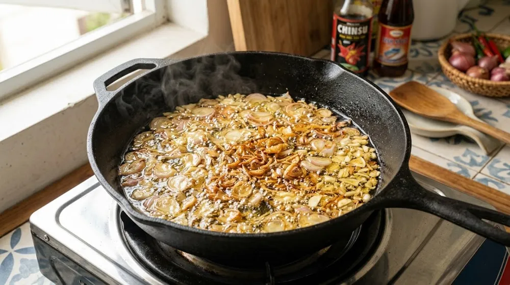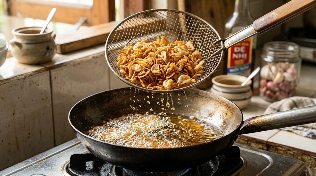 Tóm tắt nhanh: Để phi hành tỏi thơm nức, vàng đều mà không bị đắng, bí quyết nằm ở việc kiểm soát nhiệt độ (bắt đầu với dầu nguội hoặc ấm nhẹ) và lấy hành tỏi ra ngay khi vừa chuyển sang màu vàng nhạt. Nhiệt dư trong dầu sẽ tiếp tục làm hành tỏi chín vàng sậm và giòn tan sau khi tắt bếp.