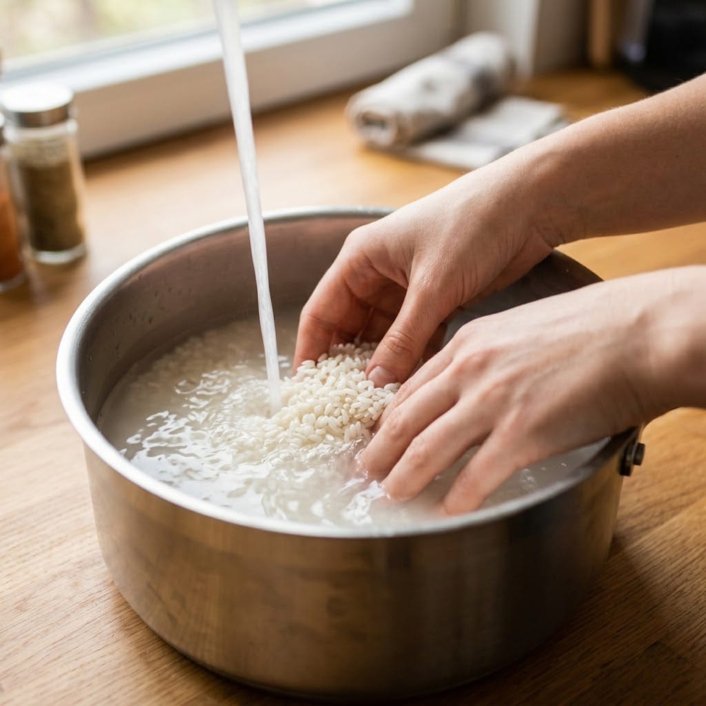 💡 Không cần chà gạo mạnh tay — chỉ khuấy nhẹ là đủ. Chà mạnh làm gãy hạt gạo, cơm sẽ bị nhão hơn.