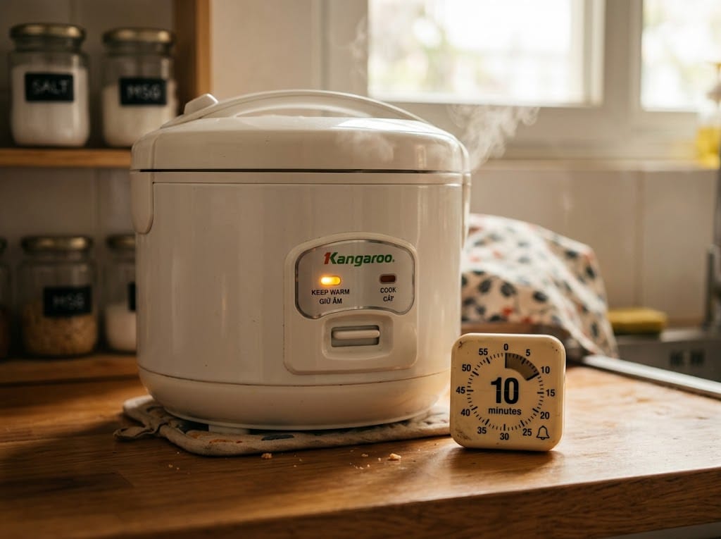 Bước 4 — Ủ 10 phút sau khi nồi chuyển sang giữ ấm Khi nồi chuyển sang chế độ "warm", chưa mở nắp — ủ thêm 10 phút. Trong thời gian này, hơi nước còn lại tiếp tục ngấm đều vào từng hạt gạo, làm cơm chín đều từ trong ra ngoài. Mở nắp sớm = mặt cơm nhão, đáy cơm sống.